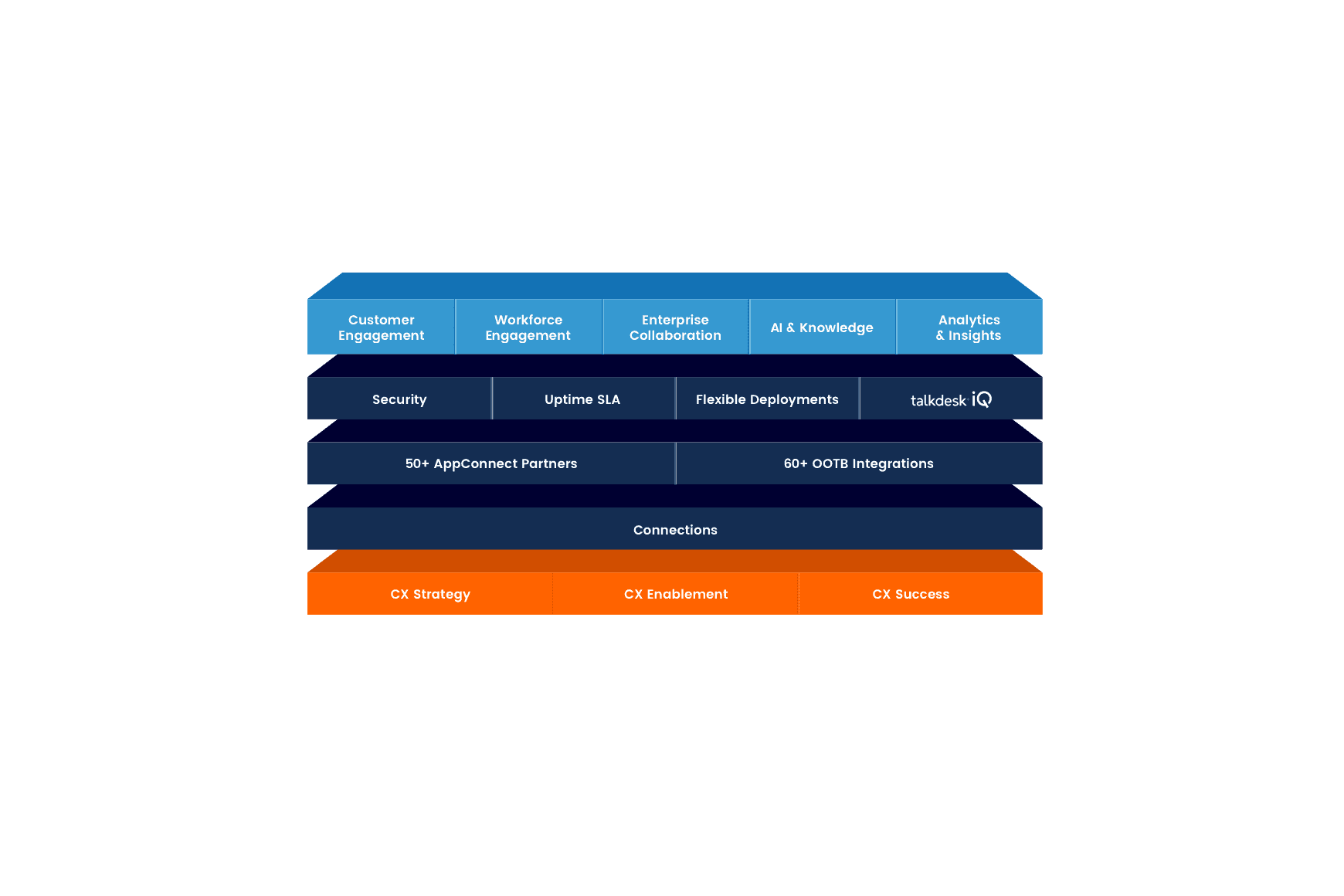 Talkdesk CX Cloud™ es una solución integral de experiencia del cliente, con la suite nativa más completa de aplicaciones para centros de contacto en una sola plataforma. La solución incluye aplicaciones para engagement con el cliente, compromiso con la fuerza laboral, colaboración de los empleados, AI & Knowledge y Analytics & Insights..