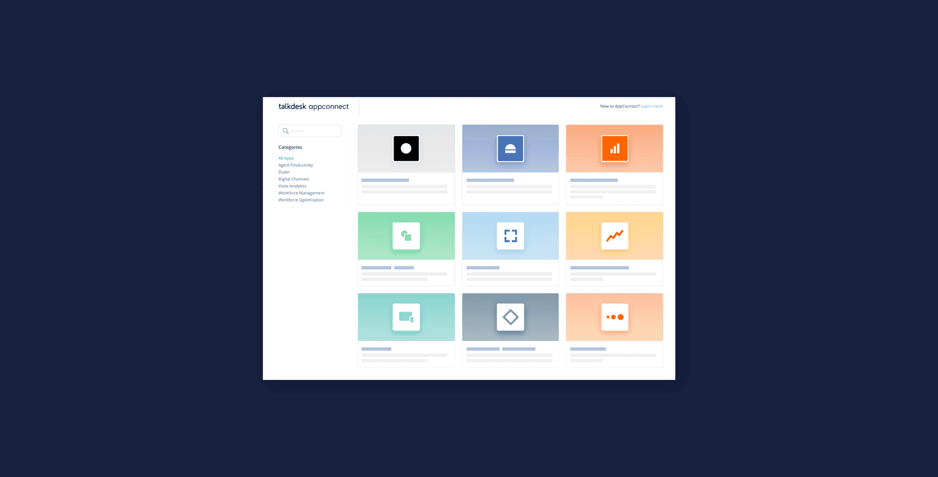 Talkdesk® AppConnect™ is a customer experience solutions marketplace that connects you with best-in-class contact center applications, devices and services with one-click installation and 30-day free trials.